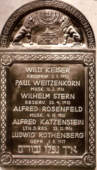 Im Gefolge der deutschen Niederlage von 1918 und der Diskussion um die Ursachen der Niederlage gibt es erneut einen starken antisemitischen Schub in der deutschen Bevölkerung. In dieser Zeit stellt die jüdische Gemeinde "dem Gedächtnis ihrer gefallenen Söhne" eine bronzene Gedenktafel in der Synagoge auf.