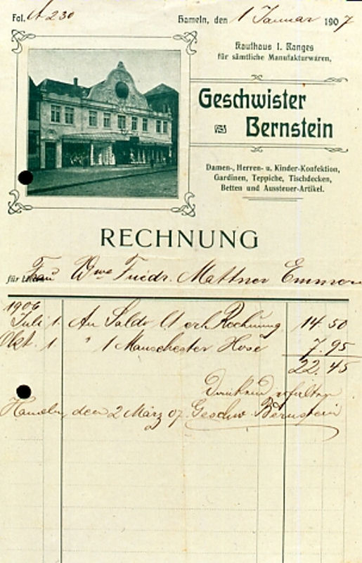 Bernstein hatte viele Kunden aus den Dörfern westlich von Hameln. Das war mit ein Grund, weswegen er gegen alle Anfeindungen – Hitlerjungen fotografierten Käufer beim Betreten des Geschäftes –sein Geschäft bis in das Jahr 1938 offen halten konnte.
